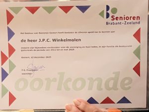 Vrijdagavond 12 december 2025 op de vrijwilligersavond is Jan Winkelmolen in het zonnetje gezet voor zijn jarenlange grote verdiensten voor onze seniorenvereniging. Hij ontving uit handen van onze vicevoorzitter Koos Beenen de zilveren speld met bijbehorende oorkonde.